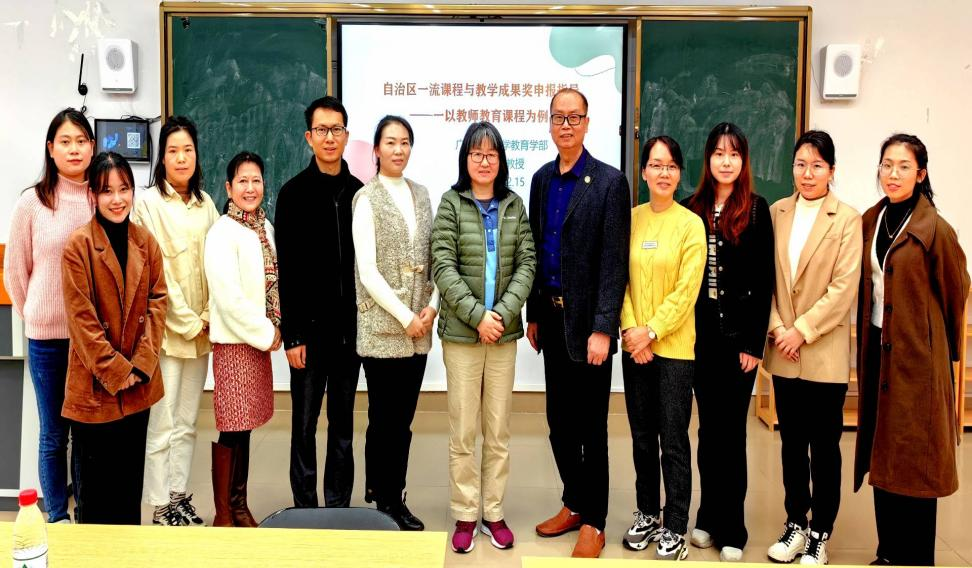 为推进一流课程申报和教学成果奖培育,助力教师深度理解一流课程的建设内涵与教学成果奖申报要点,12月15日上午,教育学院邀请广西师范大学教育学部李红惠教授以教师教育课程建设为例,在嘉善楼6242实训室做“自治区一流课程与教学成果奖申报指导”讲座。讲座由学院副院长黄小玲主持,院长彭超教授和小学教育、学前教育相关教师参与。