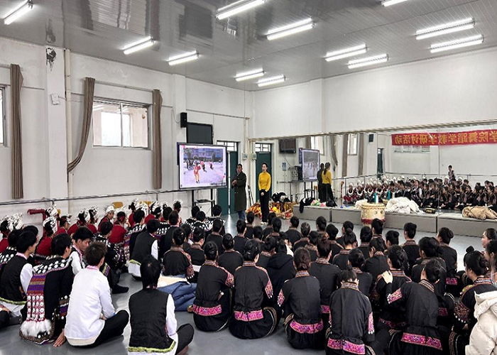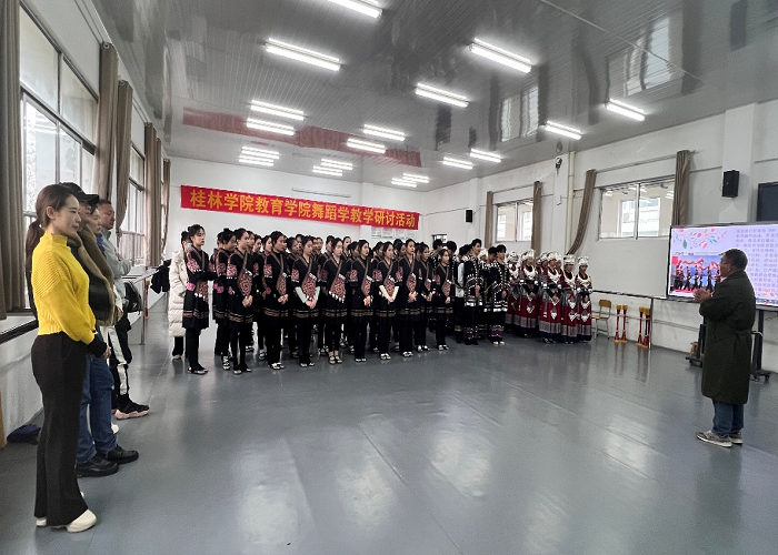12月9日,教育学院邀请广西壮族自治区级非物质文化遗产传承人陶振喜老师来到学校,为舞蹈学专业的学生介绍“香龙舞”的起源和技法。舞蹈教研室主任岑晓玲、副主任苏原春、专任教师李倩、赵毅坚和2021级、2022级舞蹈学全体学生参加了研讨教学。