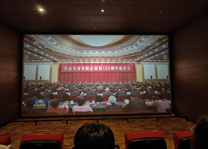 在观影之前,大家集体观看了中共中央举行纪念毛泽东同志诞辰130周年座谈会的新闻报道,共同学习了习近平总书记在座谈会上发表的重要讲话。