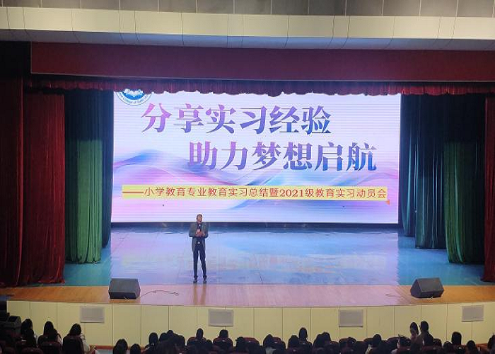 为交流实习体会、促进专业成长,教育学院于1月5日上午在弘善讲堂举行小学教育专业2020级教育实习总结与2021级教育实习动员大会。院长彭超、党总支书记周杰、副院长黄小玲、党总支副书记宋丹阳以及小学教育教研室老师,小学教育专业实习生和2021级学生参与会议。