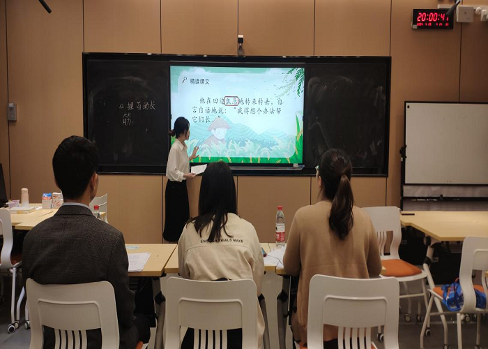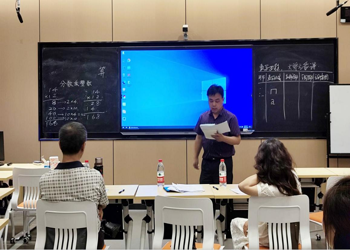 比赛分为初赛选拔和现场选拔两个阶段,比赛分为语文类学科组和数学类学科组。4月上旬学生们积极报名参与,精心准备教学设计和试讲视频。经过教研室认真评选,最终确定21名学生进入现场决赛。现场决赛于4月25日在2203、2204教室进行。学生们在教学设计、教学课件的基础上,进行了5分钟模拟上课和板书展示。评委组由校外专家和校内教师共同组成,他们对学生的教学设计、试讲表达与板书能力进行了全面、细致的考评。其中,特别邀请了特级教师、雁山区教研室赵息才老师、榕湖小学蒋艳老师和理工学院赵强教授担任决赛评委。