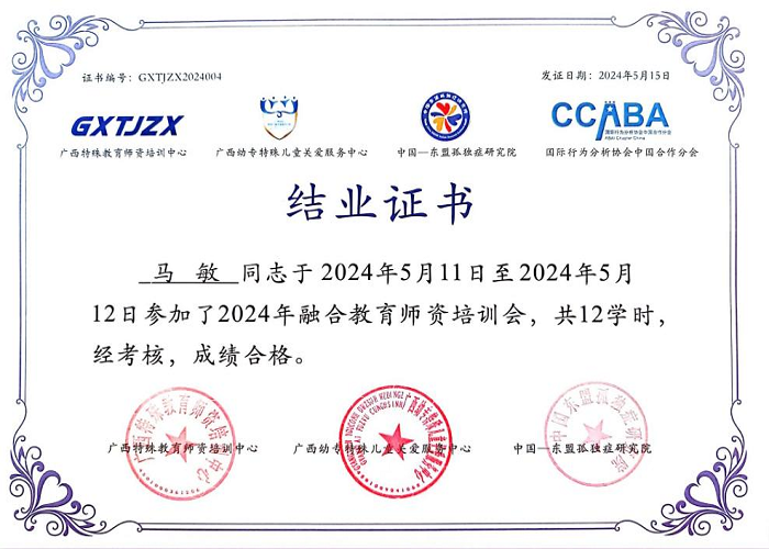培训会以工作坊的形式对自然行为发展干预模式、融合环境下各种策略的综合运用、融合教育孤独症谱系儿童的“重要补剂”、融合教育背景下自闭谱系障碍儿童发展特点及干预指导临床实践等主题进行了分享和探讨。会议主讲教授分享了融合教育与孤独症儿童教育新的研究成果。马敏老师认真聆听专家学者的讲授,并与同仁积极交流,尝试拓展学生融合幼儿园教育教学实践机会,有力推动学前教育融合教育方向的发展,顺利获得培训结业证书。
