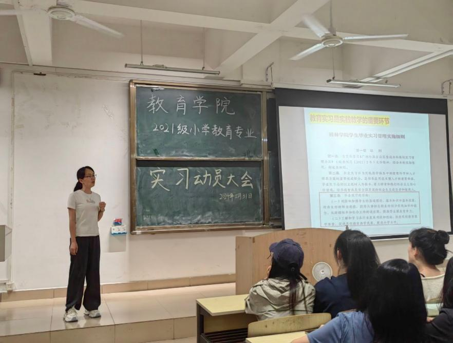 2021级小学教育专业于2024年5月31日在1207教室举行实习动员会,目的是让即将参加实习的同学提前了解实习基地、实习要求,做好实习准备。