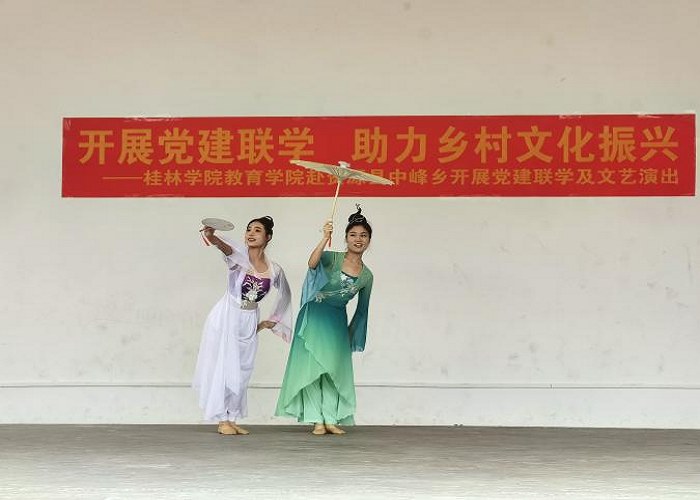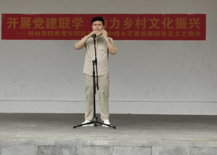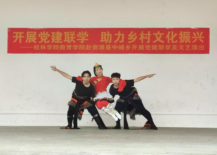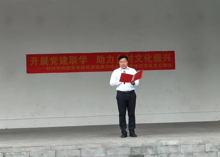 活动开始,中峰镇党委书记蒋勇文发表了热情洋溢的讲话,对桂林学院教育学院的师生表示热烈欢迎。接着,教育学院院长彭超、党总支书记周杰代表学院为中峰镇和该镇红军小学送上学院师生创作的书法和手工作品,并受广西师范大学出版社委托,为红军小学赠送了一批图书。教育学院党总支书记周杰为在场的党员干部领学了《中国共产党纪律处分条例》的部分内容,强调了条例“严管”与“厚爱”相统一的原则。随后,教育学院的老师和学生分别表演了精彩的文艺节目,有三人舞《牛背摇篮》、女声独唱《红提熟了》、双人舞《雨后》、男声独唱《把一切献给党》、陶笛独奏《赛马》和小组唱《不要怕》、双人舞《湘君夫人》、男声小组唱《中峰之恋》。在六一儿童节到来之际,中峰镇红军小学的小朋友们也前来参加了活动,他们表演了集体舞《长征路上的娃娃兵》和诗朗诵《中国话》。