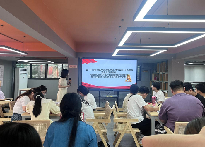 活动伊始,支部书记梁琪带领同志们学习了《中国共产党纪律处分条例》第五章内容,使支部党员对违反政治纪律行为的相关处分加深了解。接着,支部副书记任学轲展开“用生命向党组织报警——桂林七九事件三烈士事迹”的理论授课,带领同学们了解了桂林当地的红色故事。