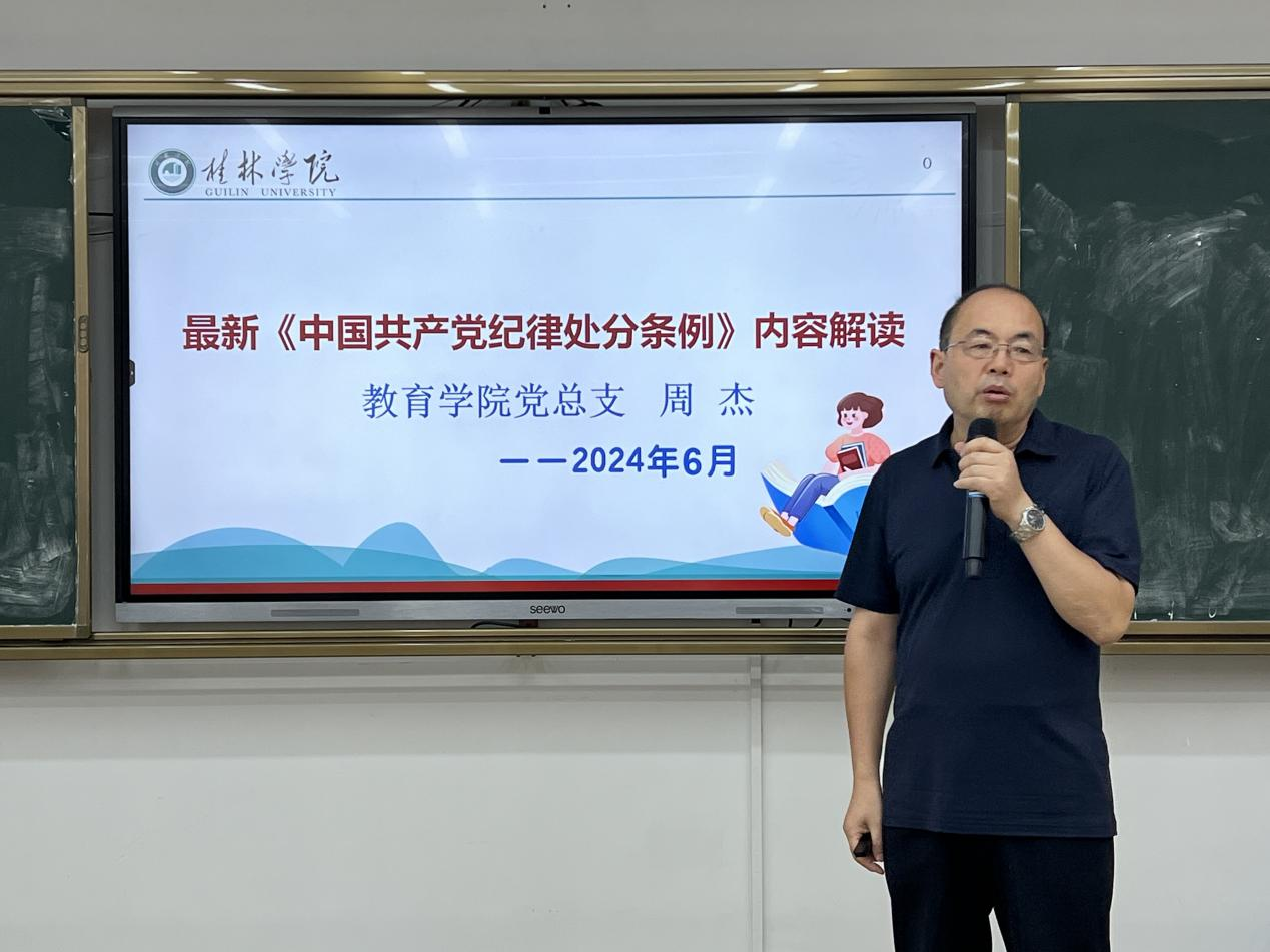 6月26日下午,教育学院全体教职工党员在嘉善楼6242教室举行了一场主题为“学党纪知于心,守底线践与行”的党日活动。本次活动旨在深化党员对党纪党规的理解,强化党员的纪律意识,提升党员的党性修养。此次活动是由两个教工支部联合举办。