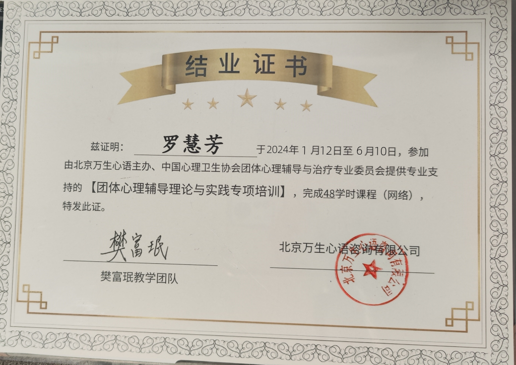 为进一步增强小学教育专业教师的心理辅导能力,提升教师团队在心理育人领域的专业素养,我院特别安排小学专业教师罗慧芳参加了总共为期6天、两阶段的樊富珉团体心理辅导专项网络培训。此次培训旨在加深教师对团体心理辅导的理解,掌握其原理、应用、策略与技术,为小学教育的学生未来工作打下坚实基础。