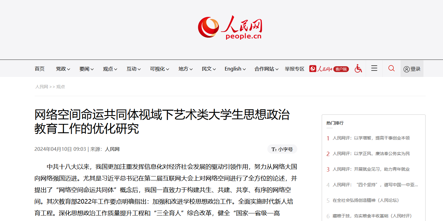 我校教育学院姚杰老师的理论文章《网络空间命运共同体视域下艺术类大学生思想政治教育工作的优化研究》于2024年4月10日在人民网“观点”栏目发表。这是学校长期重视思想政治教育研究的又一成果,也是我校教师在教学管理之外,进行科学研究取得的标志性成绩。