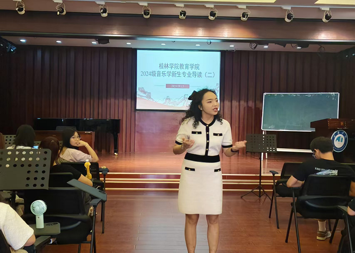 为使新生能够更快适应大学的学习与生活,及早对所修读专业有全面的认识并对未来学业、职业做好规划,教育学院组织2024级新生开展专业导航讲座。本次开展的是针对音乐学专业学生的专业介绍与发展导航,由音乐教育教研室主任胡雅珂老师主讲。胡雅珂老师分别于9月10日下午、9月13日上午于嘉善楼6246小音乐厅为2024级音乐学专业新生开展了两场专业导航专题讲座。专题讲座的主要内容围绕专业基本情况、教师团队介绍、课程开设计划、专业比赛、专业学习方法、音乐教资考试、专业考研、职业规划8个方面展开。胡雅珂老师在暑期中主要负责制定了2024级人才培育方案,对专业建设和学生发展方向有较深入的思考。