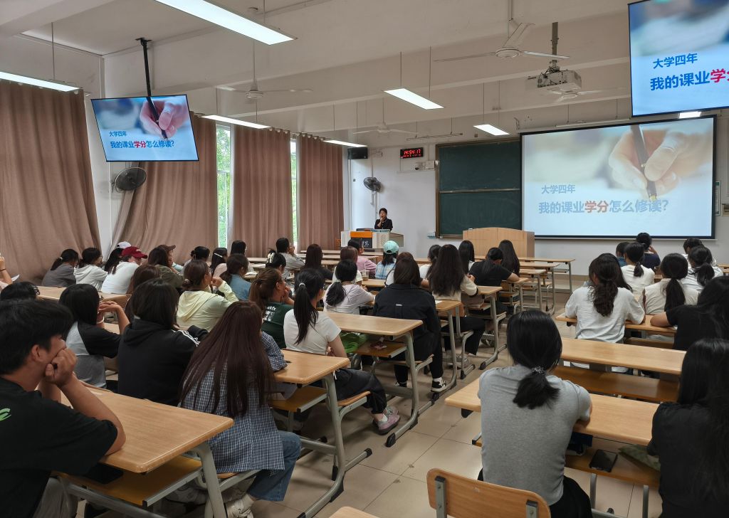 随后,教学秘书林老师进行了“大学四年我的课业学分怎么修读?”的指导。具体包括对学分修读流程、选课操作、课程学分修读、考试要求、教务系统平台操作等教学常规进行了详细讲解,对同学们容易遇到的问题进行了重点强调,比如毕业的学分、选课与上课、考试成绩、毕业论文等。希望同学们能尽快适应大学生活、学会自主学习,掌握大学学习的方式和节奏。