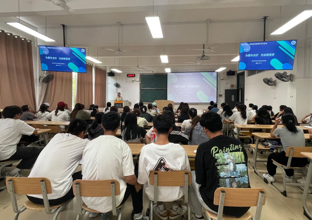 为了助力新同学了解本专业的情况,尽快投入到大学学习与生活,2024年10月9日下午,2024级学前教育专业全体新生在至善楼1312教室共同开启了本学期《专业导论(学前教育)》课程的学习。导论课程第一讲,由学前教育专业教研室副主任武文斯老师、教学秘书林敏老师为同学们进行讲授与分享。