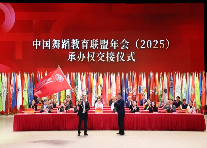 图:中国舞蹈教育联盟年会(2025)承办权“联盟旗帜”交接仪式,广东艺术职业学院院长尹新春接旗