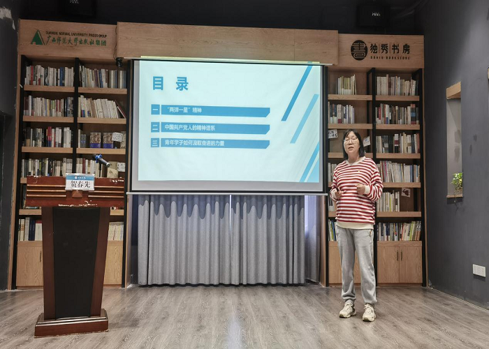 主讲教师从“两弹一星”精神切入,与师生们一起回顾了我国核事业从无到有、从小到大的壮阔历程。她从伟大建党精神,到新民主主义革命时期的井冈山精神、长征精神、延安精神,再到社会主义革命和建设时期的抗美援朝精神、大庆精神、红旗渠精神等,带领大家深刻领会中国共产党人的精神谱系的丰富内涵。主讲人表示,中国共产党人的精神谱系不仅是宝贵的精神财富,更是激励青年学子不断前行的强大动力。作为新时代青年学子,要热爱祖国、胸怀大我,同时要敢于面对困难和挑战,刻苦钻研、求索创新,不断提升自己的能力和素质,在新时代新征程担当起历史赋予的重任。