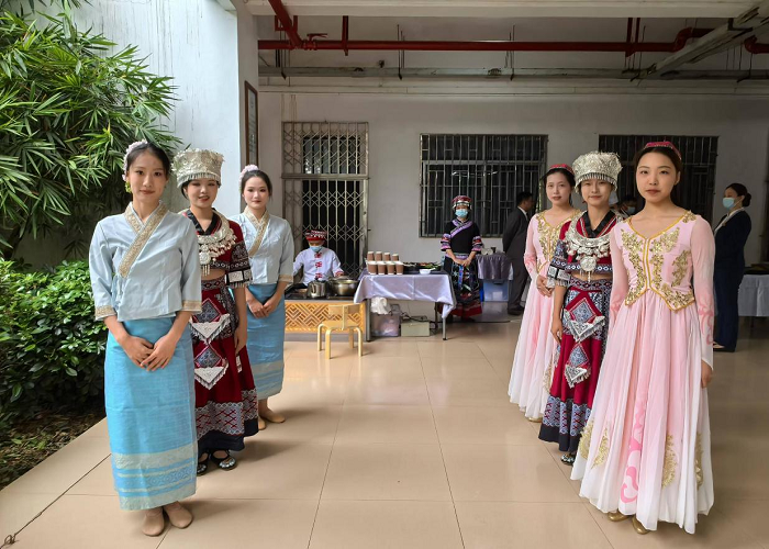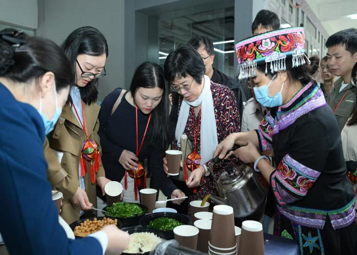 代表团参观了艺术创意展厅。这里向客人们展示了桂林的油茶、米粉文化,教育学院学生带来丰富的传统手工艺作品——团花剪纸、刻纸、丝带绣、北流舞狮头饰、鱼灯、脸谱鉴赏等。代表团一行在高度赞赏之余,现场体验了油茶、米粉、制作流程并品尝,现场气氛融洽、热烈。其中油茶、米粉是何玲教授中外文化交流与漓江文化国际传播协同创新团队的科研项目,也是地方特色课程和实践活动,同时也是大学生创新创业项目“漓江流域本土文化对外传播的价值研究”的内容之一。通过项目、课程、实践活动等教育学生讲好桂林故事,传播好桂林好声音。