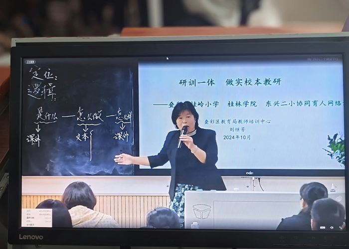 最后,桂林市叠彩区师培中心主任、桂岭小学副校长刘继芳做主题为《研训一体,做实校本教研》的专题讲座,阐述了“研训一体,共研同生,让校本真实发生”的具体做法,并以“语文核心素养导向下单元整体备课教学实施”为例,深入浅出地分析了分享了自己在教育实践中宝贵经验,提出“用专业守住教育的美好”。