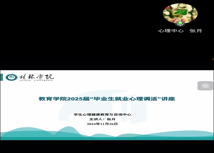 为帮助 2025 届毕业生更好地应对就业压力,调整就业心态,教育学院于11月26日召开了“毕业生就业心理调适”线上讲座。此次讲座由学校心理健康教育与咨询中心张月老师主讲,2025届毕业生参加。