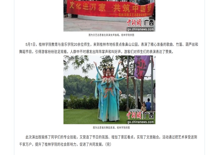 为响应中共中央宣传部等多部门“我们的中国梦 文化进万家”活动号召,五一黄金周第一天,桂林学院组织师生文艺志愿者走进桂林市象山景区,为海内外游客奉献了一场精彩的文艺表演,助力桂林市打造世界级旅游城市。