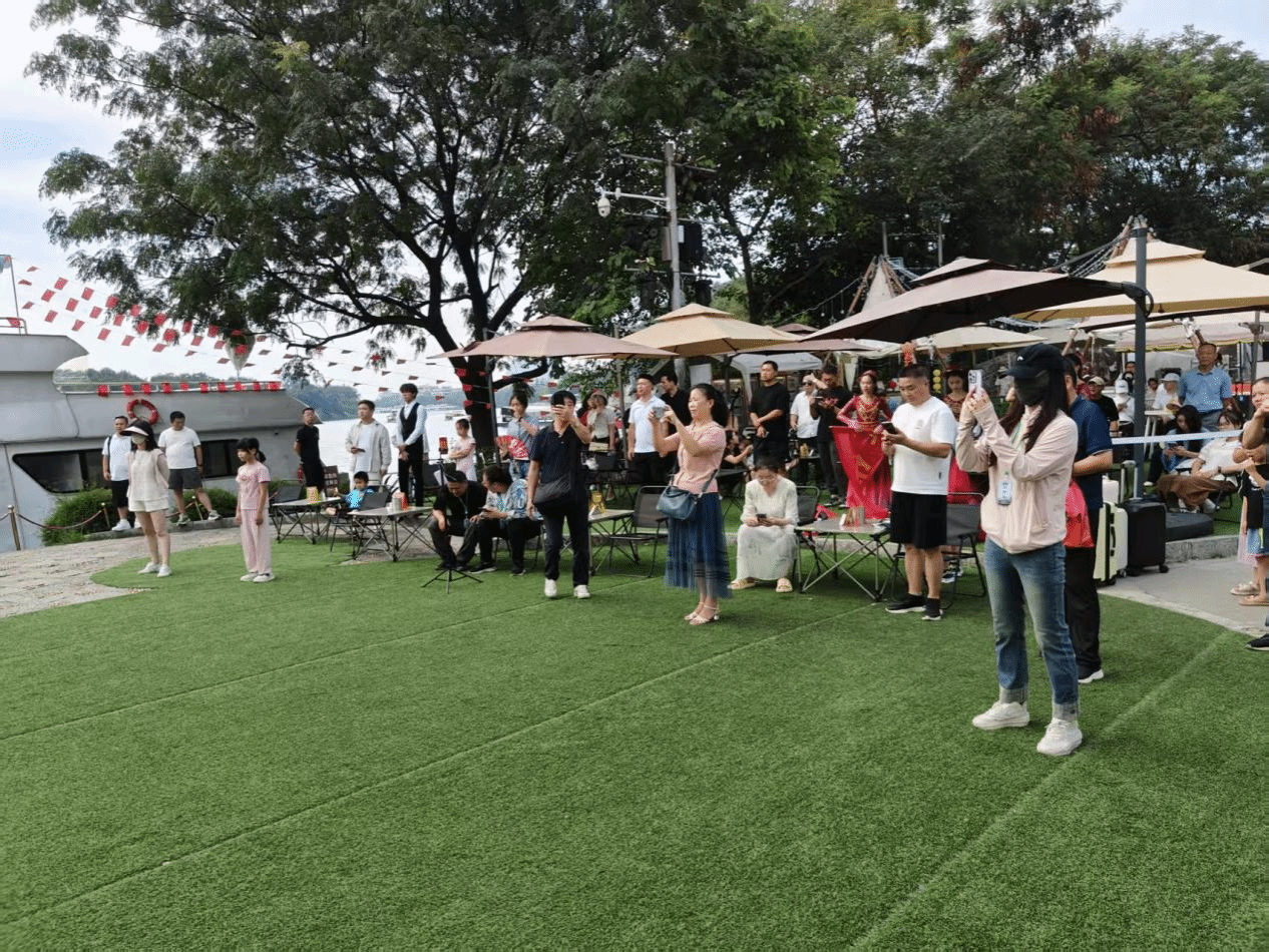 一曲唢呐独奏《小刀进行曲》突然响起,公园里漫步观光的游客迅速聚拢了过来,围住了演出区。开场曲结束,主持人出场,介绍此次桂林学院文艺志愿者走进象山公园义务演出、欢度国庆的安排,现场游客反响热烈,掌声响起,纷纷拿起手机拍照、录像,现场还有人放飞了无人机,进行空中拍摄。