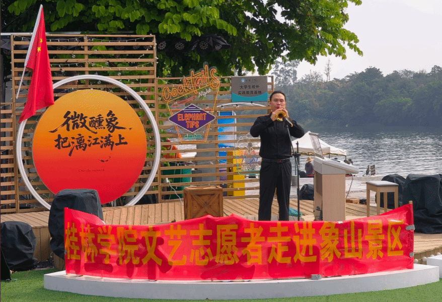 国庆节当天,桂林学院教育与音乐学院党总支组织文艺志愿者赴象山景区,以丰富多彩的文艺表演,与天南海北的游客共同庆祝伟大祖国的生日。