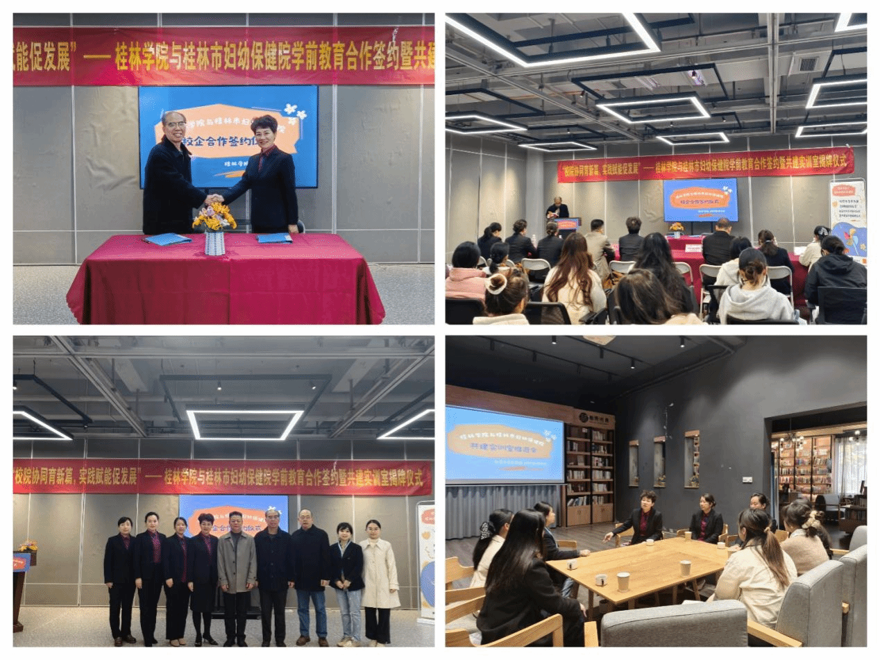 11月21日上午,桂林学院与桂林市妇幼保健院在桂林学院艺术创意展厅隆重举行合作签约暨共建实训室揭牌仪式。本次活动以“校院协同育新篇,实践赋能促发展”为主题,标志着双方在学前教育专业领域的合作迈入实质性阶段,为进一步推动产教融合、优化实践教学资源奠定了坚实基础。