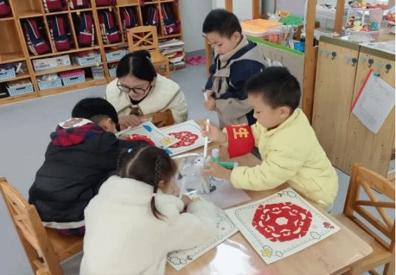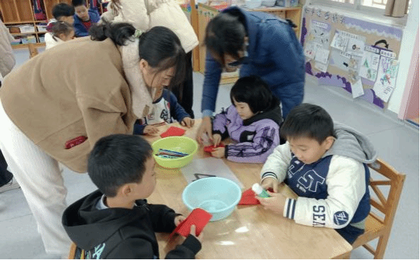 图3-4 老师、团队成员协助指导幼儿进行剪纸的制作