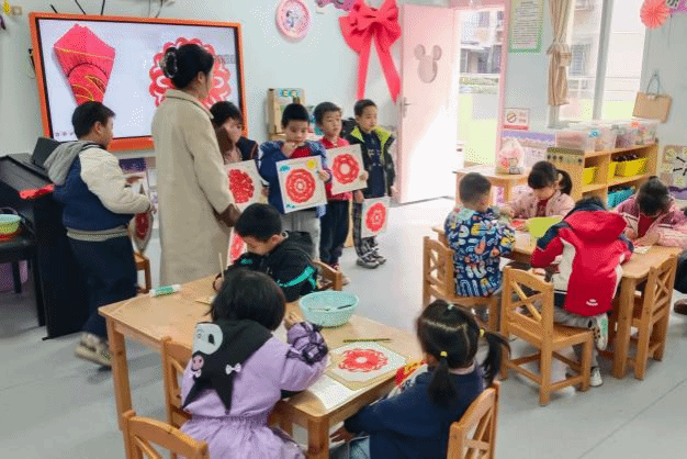 教学环节中,团队借助多媒体课件和实物示范清晰演示六角团花“对折、勾画、裁剪”等核心步骤,成员们分组协助、耐心指导,手把手教孩子们掌握折纸、画样、裁剪的技巧。孩子们专注投入,小手指在红纸间灵活穿梭,经过一番创作后,一张张普通的红纸变成了造型别致、花纹各异的六角团花。随后,分发卡纸让幼儿们将团花剪纸贴在卡纸上,还可以发挥想象,用彩笔添画桂林山水等自己喜欢的元素,让传统团花与童真创意碰撞出独特火花,一幅幅精美的装饰画跃然眼前。