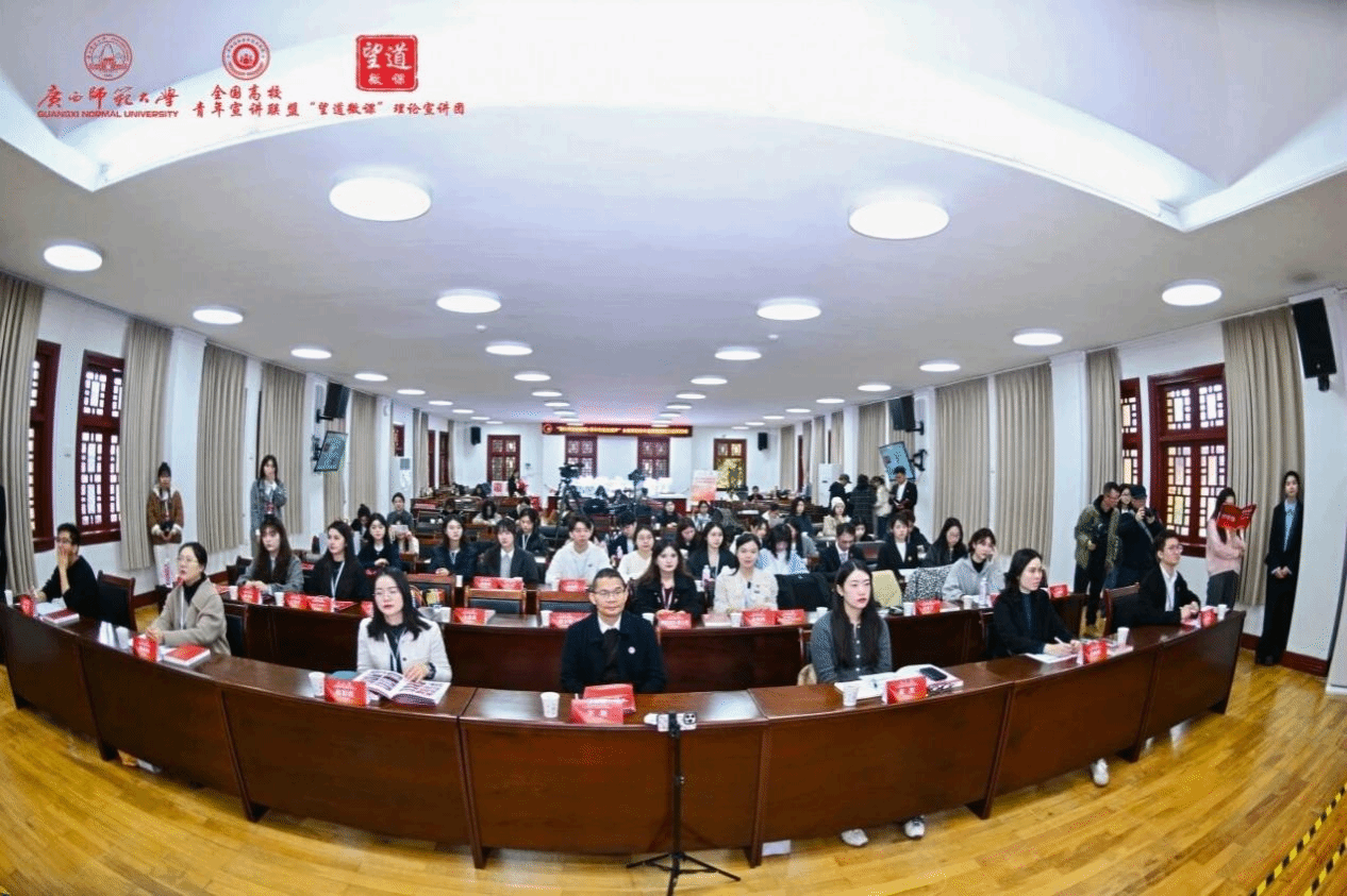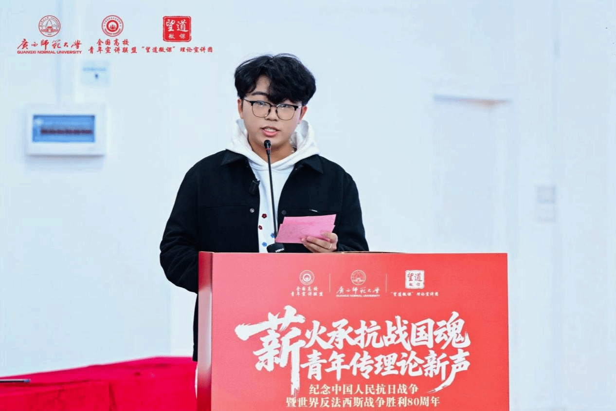 为纪念中国人民抗日战争暨世界反法西斯战争胜利80周年,推动全国高校理论宣讲工作交流互鉴与协同创新,12月5日,由全国高校青年宣讲联盟指导、广西师范大学主办的“薪火承抗战国魂,青年传理论新声”全国高校青年宣讲联盟接力宣讲活动在王城校区成功举办。我校宋丹阳老师和“政”青春大学生理论宣讲团成员参加此次活动。