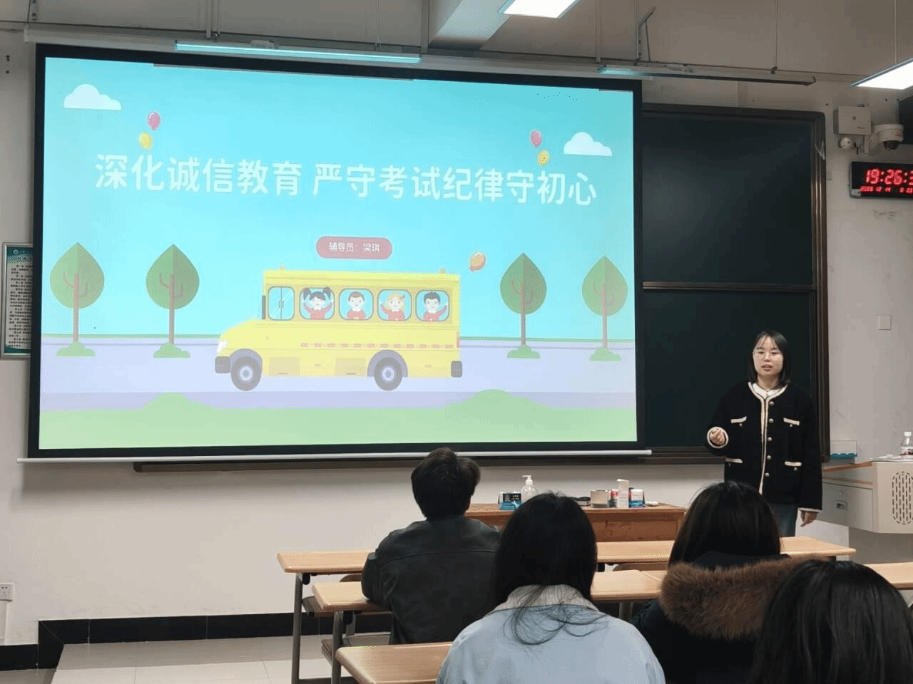 在班会中,辅导员结合近期考试安排,通过案例讲解,向同学们解读了学校考试违纪处理办法,明确作弊行为对学业、个人发展的影响,打破“小抄无关紧要”的侥幸心理。随后,班级同学围绕“诚信应考与初心担当”展开讨论,多名学生代表分享感悟,承诺以真实成绩检验学习成果,不越纪律红线,将诚信应考的理念转化为实际行动。