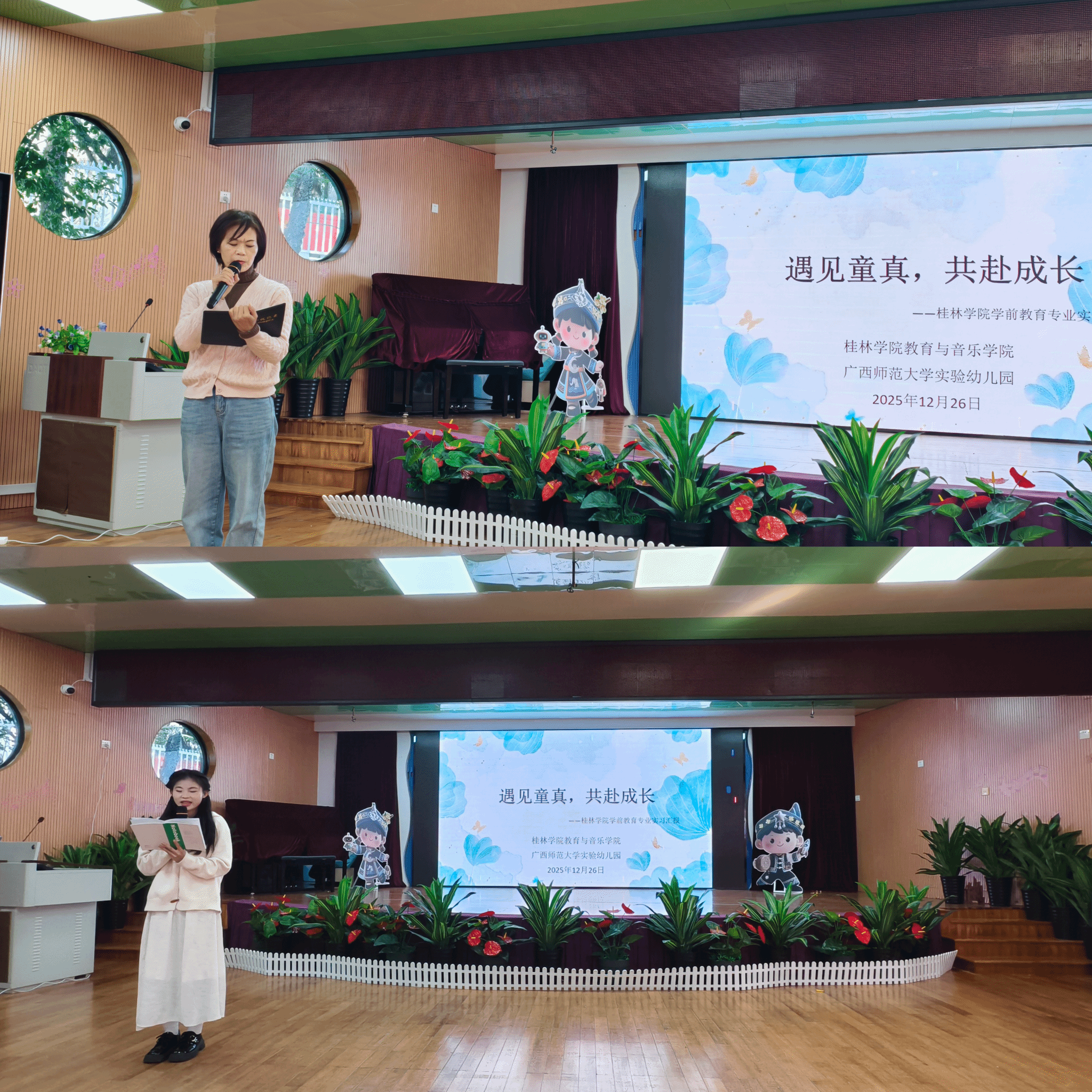 12 月 26 日上午,桂林学院教育与音乐学院学前教育专业11 名实习生,在广西师范大学实验幼儿园顺利开展实习总结汇报会。实验幼儿园何园长、教学副园长、教导主任及桂林学院实习指导老师共同出席,见证实习生的成长与收获。