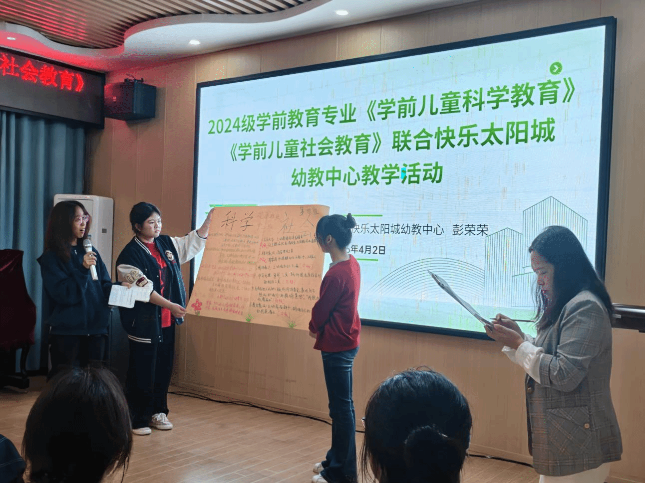 为深化产教融合,打通学前教育专业理论与实践教学的衔接通道,4月2日下午,教育与音乐学院2024级学前教育专业全体学生走进雁山区快乐太阳城幼教中心,开展本学期《学前儿童科学教育》《学前儿童社会教育》课程首次现场联合授课,特邀园所彭荣荣园长担任双师导师。