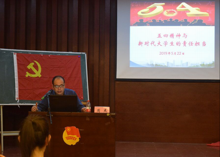 学院党总支书记周杰以“五四精神与新时代大学生的责任与担当”为题开始本次讲座,讲话内容分三个部分:一是五四运动与五四精神;二是五四精神的当代价值;三是新时代青年的社会责任与担当。周杰书记介绍了五四运动历史背景、发展经过,强调五四运动虽然开始是学生运动,但后来发展成为全国、全民族的爱国运动,是一场彻底的反帝反封建运动,直至取得最后的胜利。周杰书记还就五四青年的“爱国、进步、民主、科学”的精神进行拓展和阐释,把五四精神与当代青年的任务结合起来,号召大家要继承和发扬五四青年所表现出的自强精神、忧患精神、革新精神、开放精神、理性精神、务实精神;讲座的最后部分,周杰书记根据自己的理解,告诉大家,中国特色社会主义进入新时代,大学生应该如何体现应有的社会责任与担当。讲座引经据典,线索清晰,深入浅出,充满热情,激发了同学们的共鸣,启发了同学们的思考,大家感到收获良多。