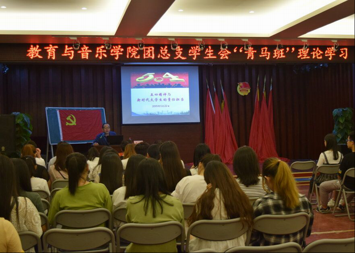 2019年5月22日晚上7点在艺术楼二楼音乐厅,教育与音乐学院团总支学生会开展“青春心向党,建功新时代”为主题的“青马班”理论学习,本次理论学习由教育与音乐学院党总支书记周杰主讲,团学王邓老师、赵红老师以及教育与音乐学院团总支学生会全体成员到场学习。