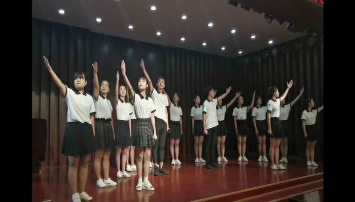 第二个节目齐唱《我宣誓》,是根据入党誓词谱写的一首歌曲。在演唱之前2016级音乐学的李婵芬同学激动地跟大家分享了她入党的心路历程,打动了台下的师生。学生演唱得铿锵有力,激情澎湃,唱出了入党的自豪及为党的事业奋斗的决心。