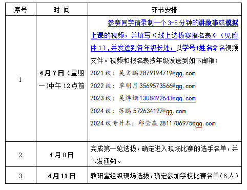 - 模拟上课(含板书):选手根据自己的教学设计,选取核心内容进行模拟上课,用时10分钟。评委组综合考评参赛学生的综合水平,确定参加学校决赛的人选(6人)。 - 四、评比规则 - 本次大赛满分100分,具体比赛评分标准与区级比赛标准一致。 - 五、奖项设置 - 现场比赛设一等奖、二等奖、三等奖。 - 赛事根据需要安排如下人员负责比赛相关工作: - 教师工作负责人:张旭老师(电话:18593275659 QQ:973977205) - 何琪欣老师(电话:18978828126 QQ:864679173) - 教育学院学前教育教研室 - 2025年4月1日