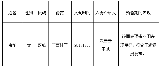 在征求党员、群众意见的基础上,经支部委员会审查,拟将余华同志转为中共正式党员。根据发展党员工作有关要求,现将其有关情况公示如下: