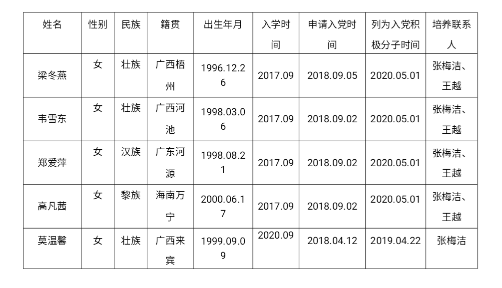 经支部大会研究同意,将梁冬燕等5位同志列为发展对象人选。根据发展党员工作有关要求,现将其有关情况公示如下: