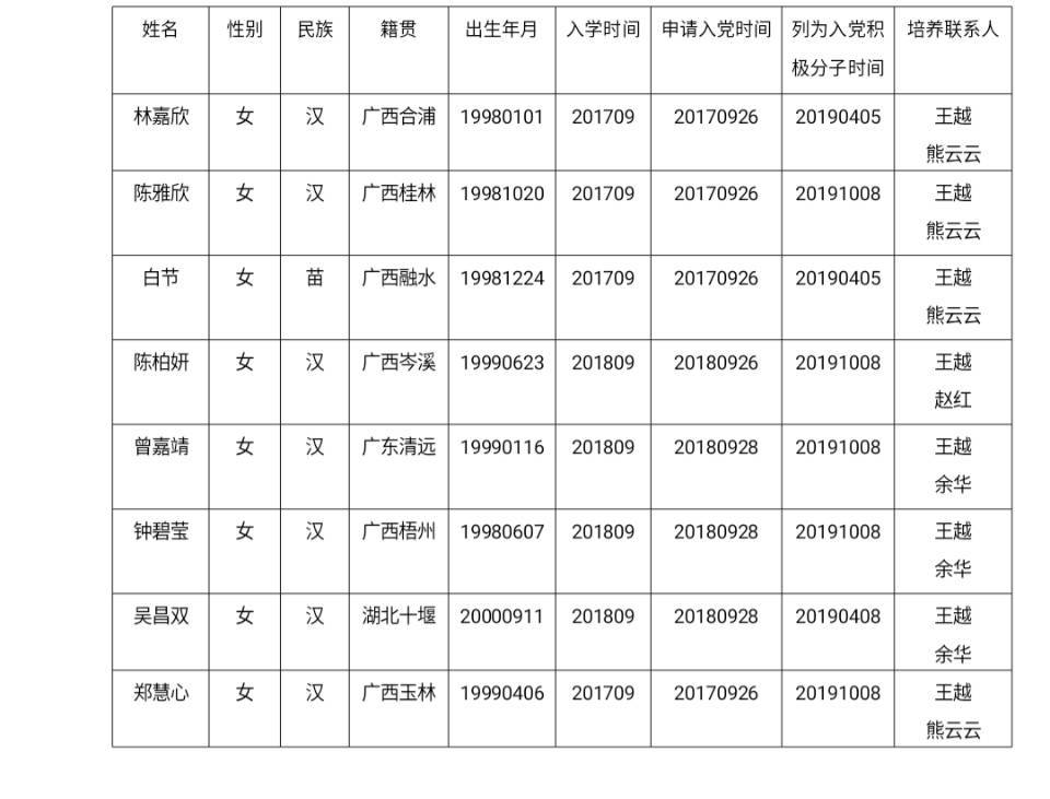 经党支部培养教育和考察,以上同志已基本具备党员条件,在征求党小组、培养联系人、党员和群众意见的基础上,经支部委员会2020年11月5日讨论同意列为发展对象人选。