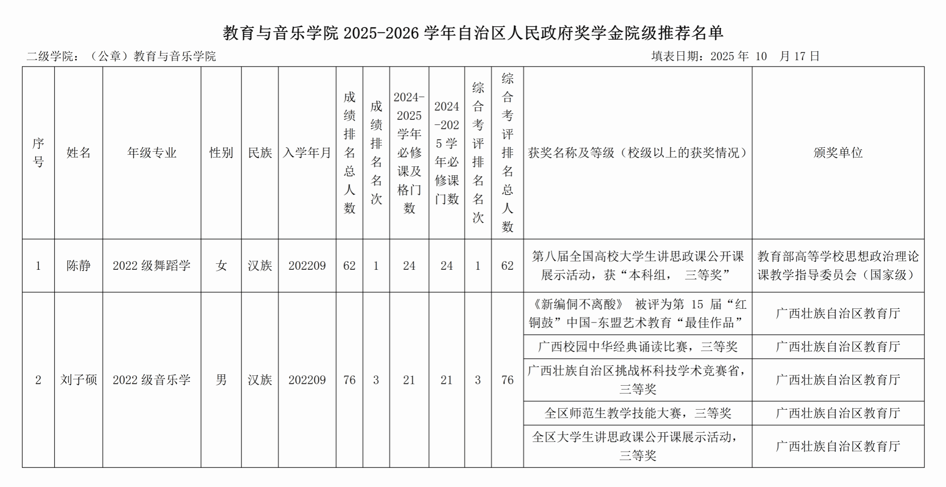 附:教育与音乐学院2025-2026学年自治区人民政府奖学金院级推荐名单公示