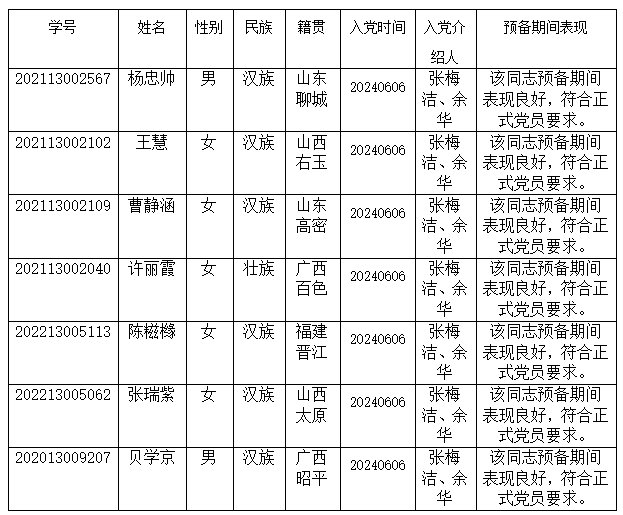 在征求党员、群众意见的基础上,经支部委员会审查,拟将杨忠帅等7位同志转为中共正式党员。根据发展党员工作有关要求,现将其有关情况公示如下: