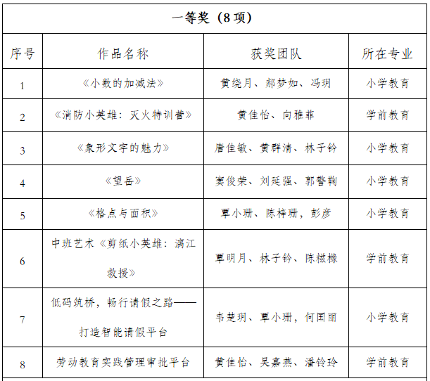 为贯彻落实国家教育数字化战略行动,加强我院师范生数字素养与技能培养,提升师范生信息化教学能力,学院自4月07日——4月21日组织小学教育、学前教育、音乐学等师范类专业学生参加学院开展的第七届师范生信息化教学应用比赛,比赛分为数字资源制作类、课堂教学应用类、数字化应用场景创建类3个类别。按照本着参照自治区赛评审标准的原则,经过严格评审,一共评选出一等奖 8项、 二等奖 10项、三等奖12项。根据学校大赛文件“各学院限额分配”原则,我院推荐评分排序前13项作品参加校赛,现将获奖名单予以公布。
