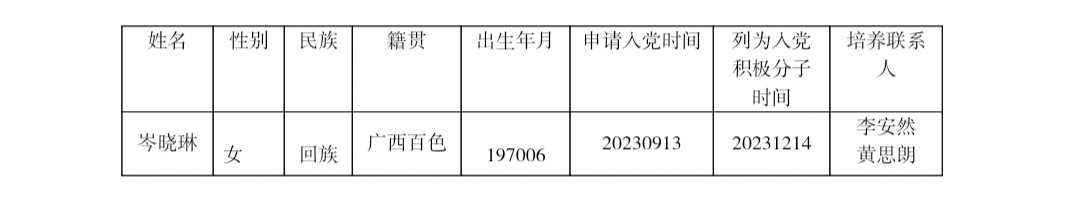 经支部委员会研究同意,将岑晓琳同志列为发展对象人选。根据发展党员工作有关要求,现将其有关情况公示如下:
