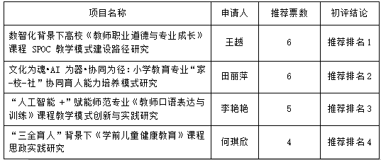 根据教务处《关于组织申报2025年度广西高等教育本科教学改革工程项目的通知》要求,我院面向全体专任教师组织开展本次申报工作。经教师个人提交申报材料、学院第一届教学指导分委员会全体委员独立评审投票、打分,按照“推荐票数高低排名;推荐票数一致的,以评审平均分高低排序”的原则,王越等四位老师申报材料排名前四,拟推荐申报: