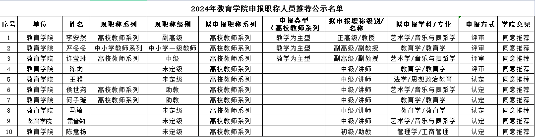 教育学院李安然等11位同志拟参加2024年职称申报工作,现根据有关规定予以学院推荐名单公示。公示时间从2024年11月12日至2024年11月14日共三天,在公示期间,如对所公示名单有异议,请用书面材料并署真实姓名向学院职称联络员反映。联系人:黄丽娟,联系电话:0773-3696239。