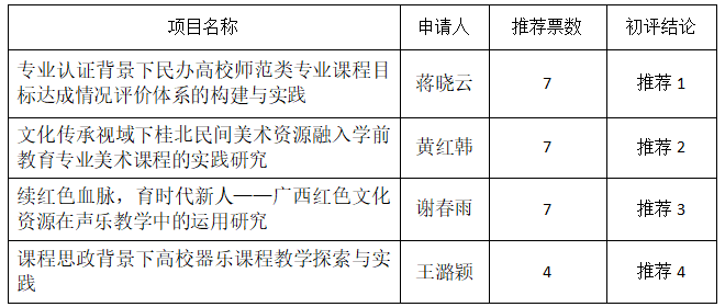 根据教务与产教融合处《关于组织申报2024年度广西高等教育本科教学改革工程项目的通知》要求,我院面向全体专任教师组织开展本次申报工作。经教师个人提交申报材料、学院第一届教学指导分委员会全体委员独立评审投票、打分,按照“推荐票数高低排名;推荐票数一致的,以评审平均分高低排序”的原则,蒋晓云等四位老师申报材料排名前四,拟推荐申报: