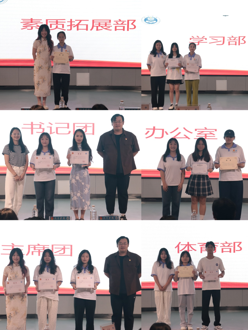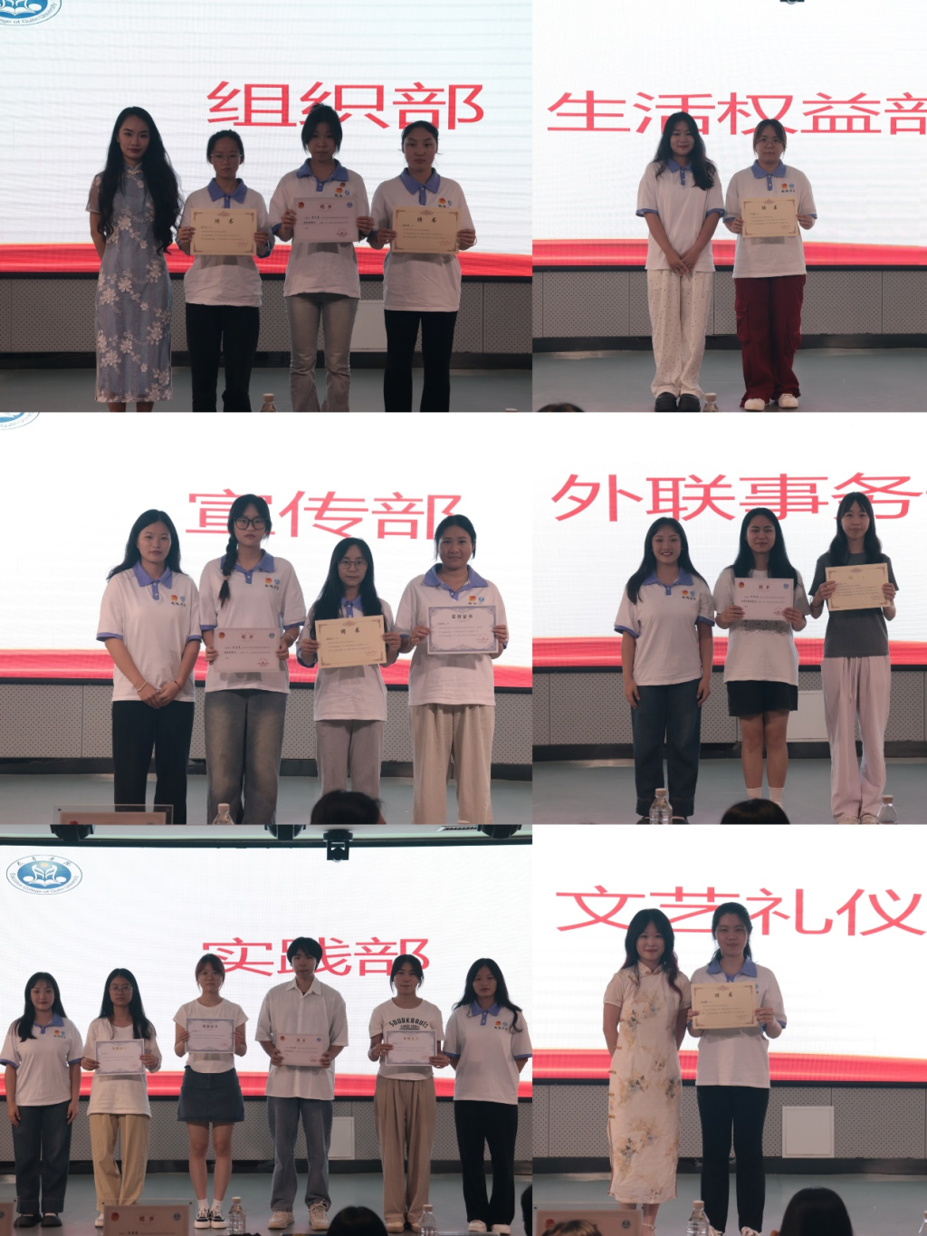 会议开始,各部门精心准备了才艺表演来欢送即将退任的第一届团学干部们,每一个部门都带来了精彩的歌唱节目。随后,由陈意扬老师和谭小莉老师为卸任的团学干部颁发聘书并合影留念。
