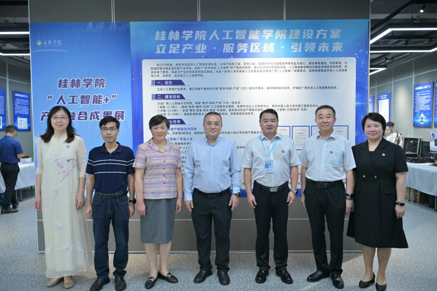 仪式最后,与会领导与嘉宾共同参观了学校“人工智能+”产教融合成果展,展览集中呈现了桂林学院在人工智能领域的前期探索与实践,包括智能机器人、大数据分析平台、机器学习算法应用、智慧教育解决方案等多个项目,成果展生动展现了学校“立足应用、服务地方”的办学理念,也为新成立的人工智能学院描绘了充满潜力的发展图景。