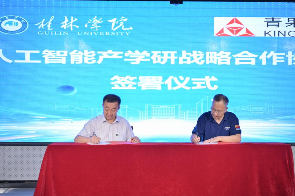 随后,周彦副市长、杨伟嘉会长、陶毅董事长、吴郭泉校长共同为“桂林学院人工智能学院”揭下红色帷幕;吴郭泉校长代表学校与企业方代表青果软件集团有限公司董事长张光铎共同签署《人工智能产学研战略合作协议》;同时,由桂林学院牵头,联合区内高校、桂林市重点产业园区及十余家人工智能科技企业共同组建“桂林学院人工智能产教融合共同体”宣告成立。