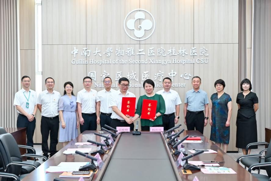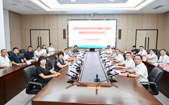 为推进落实市委市政府的决策部署,响应国家区域医疗中心建设战略,推动优质医疗资源扩容与均衡布局,9月19日上午,在市委市政府的大力支持下,学校与中南大学湘雅二医院(国家区域医疗中心)签署高质量发展合作协议框架协议;学校董事长陶毅,校领导吴郭泉、康庚莲、杨庆庆,中南大学湘雅二医院桂林医院医院领导刘先领、李明、范伟娟、范峻峰及双方中层干部代表出席本次签约仪式。签约仪式在湘雅二医院桂林医院临桂园区举行。