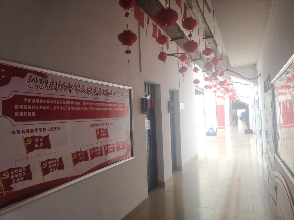 为庆祝中华人民共和国成立70周年,体育与健康学院师生们认真做好校园宣传和氛围营造工作,近期对学院内部进行了环境布置。