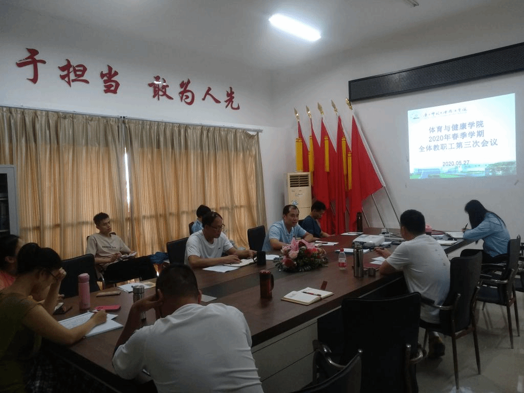 2020年5月27日下午,体育与健康学院在彰善楼四楼会议室召开2020年第三次全体教职工会议。体育与健康学院全体教职工参加,学院党总支书记刘波主持本次会议。